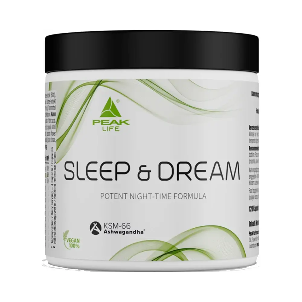 Peak Life Sleep & Dream är ett komplett sömnkomplex med melatonin, KSM-66® ashwagandha, valeriana, magnesium, zink och B-vitaminer – utvecklat för djupare sömn, bättre återhämtning och lugn inför natten.