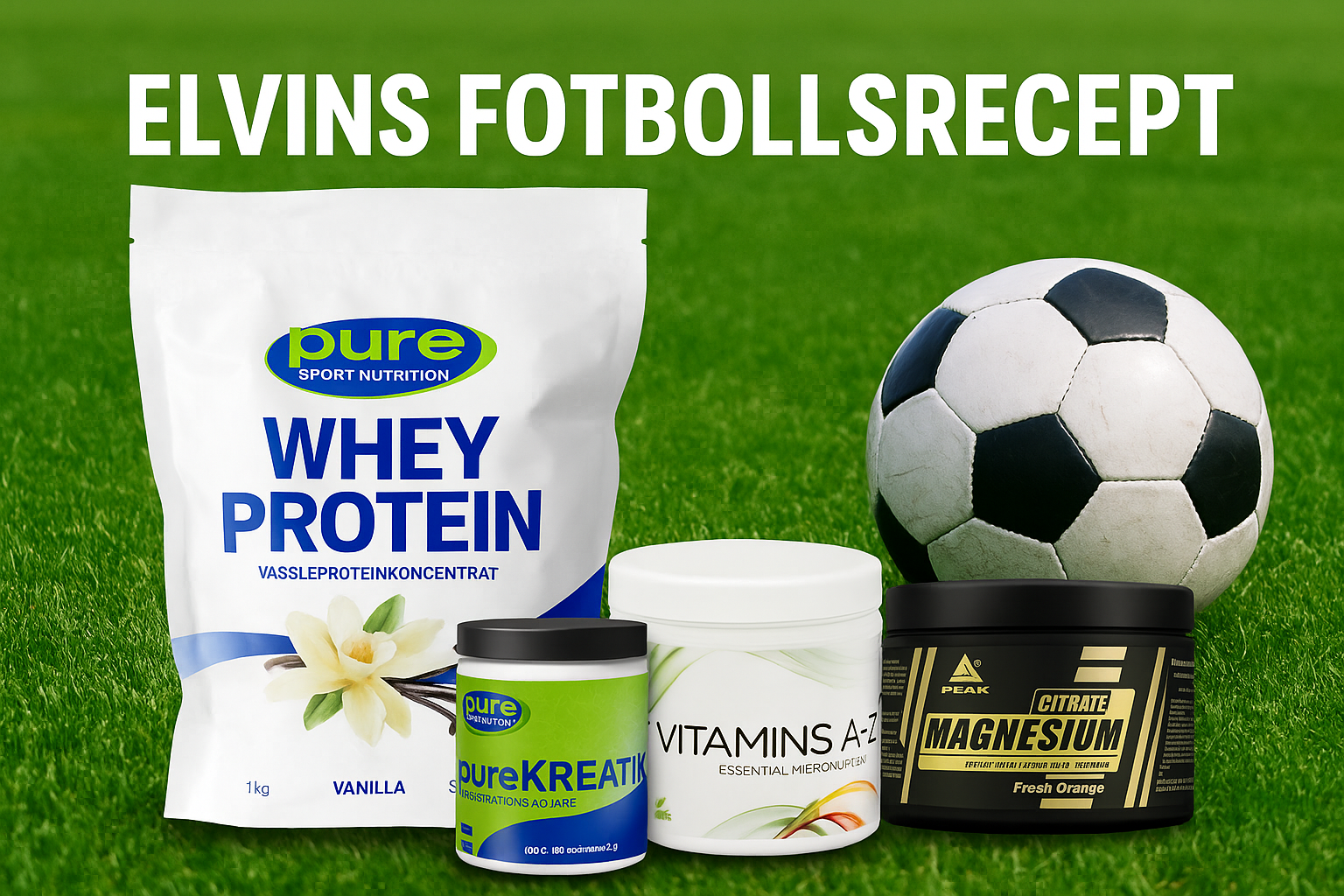 Komplett fotbollspaket inspirerat av Elvins recept. Optimerat för fokus, matchtempo och snabb återhämtning. Mix från Pure Sport Nutrition, NG Nutrition, Star Nutrition, Swedish Supplements och ibland Peak.